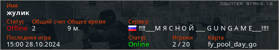 Играет на Counter Strike 1.6 сервере. Страна: РоссияПервый раз замечен 09:45 28.10.2024