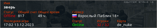 Играет на Counter Strike 1.6 сервере. Страна: РоссияПервый раз замечен 12:17 10.06.2020