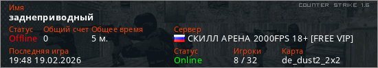 Играет на Counter Strike 1.6 сервере. Страна: РоссияПервый раз замечен 19:40 19.02.2026