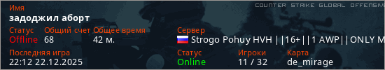 Играет на Counter Strike Global Offensive сервере. Страна: РоссияПервый раз замечен 16:18 06.12.2025