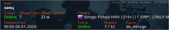 Играет на Counter Strike Global Offensive сервере. Страна: РоссияПервый раз замечен 00:00 06.01.2026