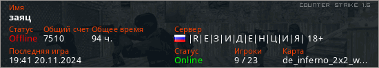 Играет на Counter Strike 1.6 сервере. Страна: РоссияПервый раз замечен 16:23 29.01.2019