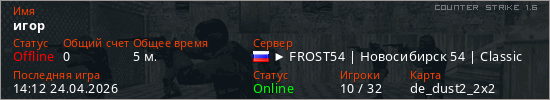 Играет на Counter Strike 1.6 сервере. Страна: РоссияПервый раз замечен 12:20 24.04.2026
