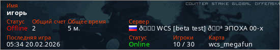 Играет на Counter Strike Global Offensive сервере. Страна: РоссияПервый раз замечен 05:27 20.02.2026