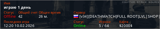 Играет на Counter Strike Source сервере. Страна: РоссияПервый раз замечен 22:58 16.01.2026