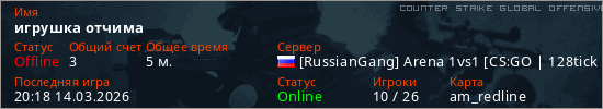 Играет на Counter Strike Global Offensive сервере. Страна: РоссияПервый раз замечен 20:12 14.03.2026