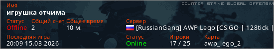 Играет на Counter Strike Global Offensive сервере. Страна: РоссияПервый раз замечен 20:23 14.03.2026