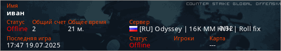 Играет на Counter Strike Global Offensive сервере. Страна: РоссияПервый раз замечен 19:01 18.07.2025