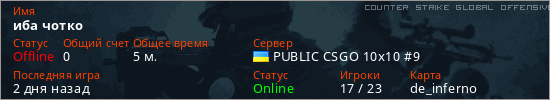 Играет на Counter Strike Global Offensive сервере. Страна: УкраинаПервый раз замечен 00:57 06.03.2026