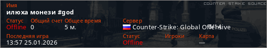 Играет на Counter Strike Source сервере. Страна: РоссияПервый раз замечен 13:36 25.01.2026