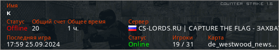 Играет на Counter Strike 1.6 сервере. Страна: РоссияПервый раз замечен 17:59 13.07.2024