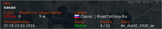 Играет на Counter Strike 1.6 сервере. Страна: РоссияПервый раз замечен 21:16 23.02.2026
