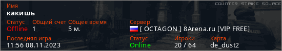 Играет на Counter Strike Source сервере. Страна: РоссияПервый раз замечен 11:36 08.11.2023