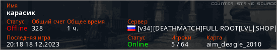 Играет на Counter Strike Source сервере. Страна: РоссияПервый раз замечен 19:16 10.01.2023