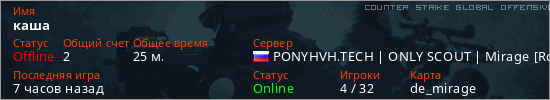 Играет на Counter Strike Global Offensive сервере. Страна: РоссияПервый раз замечен 00:41 30.03.2026
