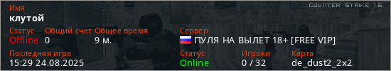 Играет на Counter Strike 1.6 сервере. Страна: РоссияПервый раз замечен 18:31 23.08.2025