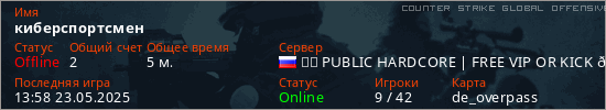 Играет на Counter Strike Global Offensive сервере. Страна: РоссияПервый раз замечен 13:54 23.05.2025