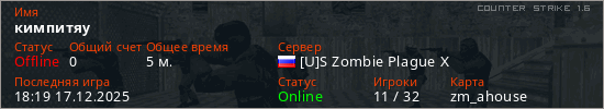 Играет на Counter Strike 1.6 сервере. Страна: РоссияПервый раз замечен 18:10 17.12.2025