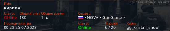 Играет на Counter Strike Source сервере. Страна: РоссияПервый раз замечен 17:17 24.10.2022