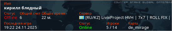 Играет на Counter Strike Global Offensive сервере. Страна: КазахстанПервый раз замечен 15:05 23.11.2025
