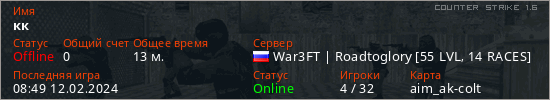 Играет на Counter Strike 1.6 сервере. Страна: РоссияПервый раз замечен 20:04 20.07.2023