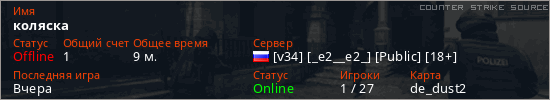 Играет на Counter Strike Source сервере. Страна: РоссияПервый раз замечен 17:56 13.02.2026