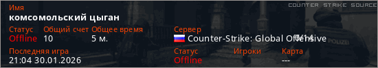 Играет на Counter Strike Source сервере. Страна: РоссияПервый раз замечен 21:02 30.01.2026