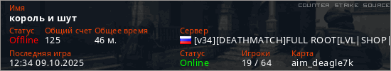 Играет на Counter Strike Source сервере. Страна: РоссияПервый раз замечен 11:02 20.03.2023