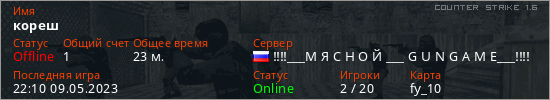 Играет на Counter Strike 1.6 сервере. Страна: РоссияПервый раз замечен 00:34 22.03.2023