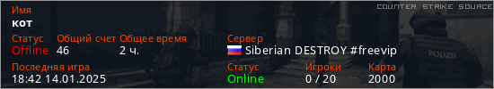 Играет на Counter Strike Source сервере. Страна: РоссияПервый раз замечен 17:44 29.01.2023