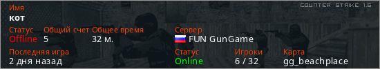 Играет на Counter Strike 1.6 сервере. Страна: РоссияПервый раз замечен 19:18 06.07.2025