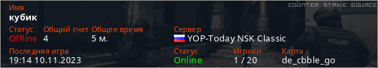 Играет на Counter Strike Source сервере. Страна: РоссияПервый раз замечен 19:10 10.11.2023