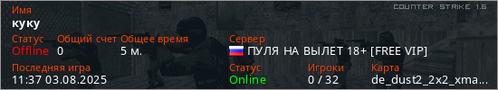 Играет на Counter Strike 1.6 сервере. Страна: РоссияПервый раз замечен 11:35 03.08.2025