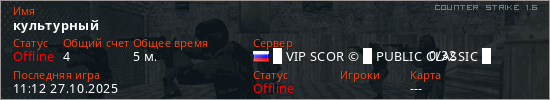 Играет на Counter Strike 1.6 сервере. Страна: РоссияПервый раз замечен 11:08 27.10.2025