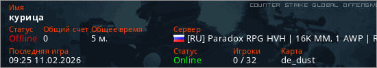 Играет на Counter Strike Global Offensive сервере. Страна: РоссияПервый раз замечен 09:21 11.02.2026