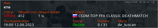Играет на Counter Strike 1.6 сервере. Страна: РоссияПервый раз замечен 09:09 19.08.2020