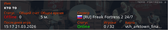 Играет на Team Fortress 2 сервере. Страна: РоссияПервый раз замечен 15:15 21.03.2026
