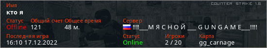 Играет на Counter Strike 1.6 сервере. Страна: РоссияПервый раз замечен 16:45 16.12.2022