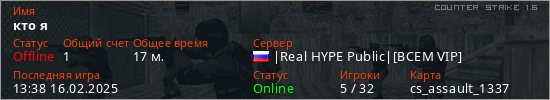 Играет на Counter Strike 1.6 сервере. Страна: РоссияПервый раз замечен 18:16 17.04.2024