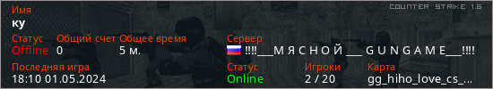 Играет на Counter Strike 1.6 сервере. Страна: РоссияПервый раз замечен 18:02 01.05.2024