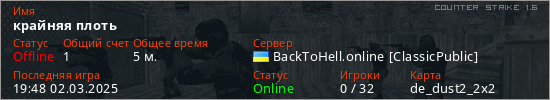 Играет на Counter Strike 1.6 сервере. Страна: УкраинаПервый раз замечен 19:29 02.03.2025