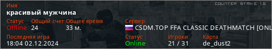 Играет на Counter Strike 1.6 сервере. Страна: РоссияПервый раз замечен 01:20 06.07.2024