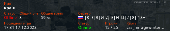 Последний раз был в сети 17:31 17.12.2023 Игрок с таким ником замечен на 14 серверах
