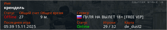 Играет на Counter Strike 1.6 сервере. Страна: РоссияПервый раз замечен 03:56 15.11.2025