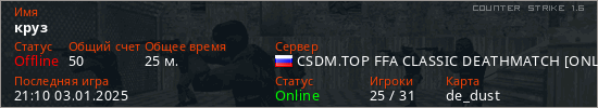 Играет на Counter Strike 1.6 сервере. Страна: РоссияПервый раз замечен 17:47 02.01.2025