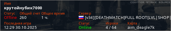 Последний раз был в сети 12:29 30.10.2025 Игрок с таким ником замечен на 5 серверах