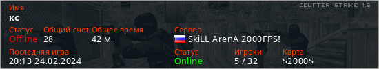 Играет на Counter Strike 1.6 сервере. Страна: РоссияПервый раз замечен 17:19 11.03.2023