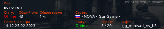 Играет на Counter Strike Source сервере. Страна: РоссияПервый раз замечен 15:53 24.02.2023