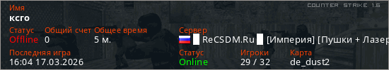 Играет на Counter Strike 1.6 сервере. Страна: РоссияПервый раз замечен 15:58 17.03.2026