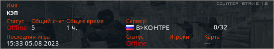 Играет на Counter Strike 1.6 сервере. Страна: РоссияПервый раз замечен 18:41 24.07.2023